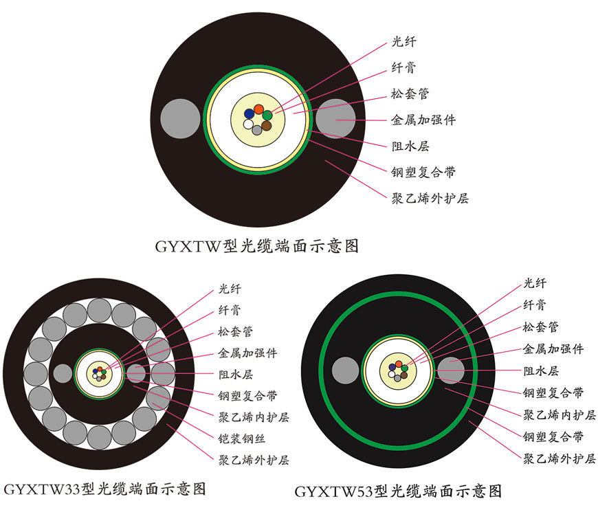 皱纹钢带铠装结构增强了光缆抗侧压、防弹、防潮性能。