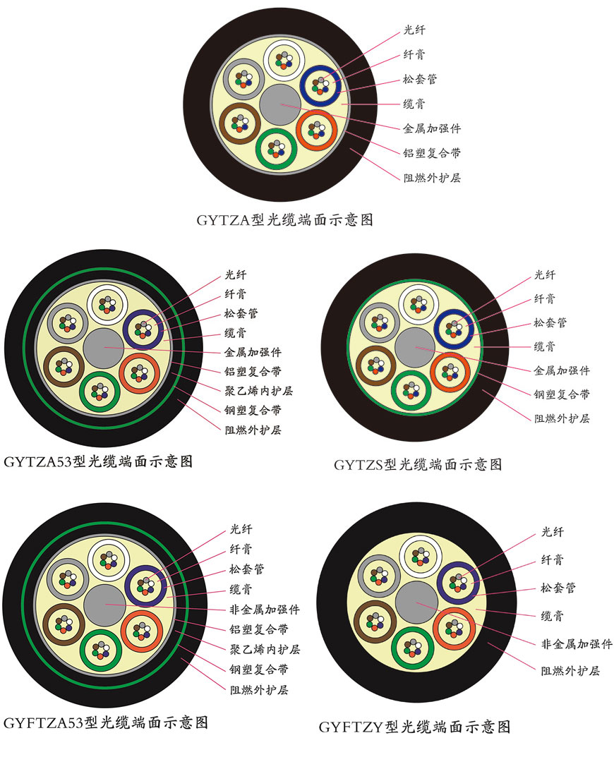 阻燃光缆的结构是将一般光缆的外层和其他层聚乙烯套改成低烟无卤(或低卤)阻燃套,其他 的原构件宜尽可能采用不燃的材料。型号表示是在一般光缆型号中加“Z”,如GYTZA、GYTZS 、GYTZY53、GYFTZY等等。